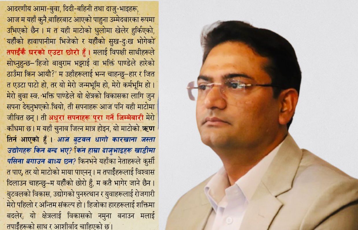 बुटवल । तिलोत्तमा नगरपालिकावासी मतदाताले रुपन्देही क्षेत्र नं –२ का उम्मेदवार सुवास पाण्डे ‘विश्वदीप’ समक्ष छाडा चौपायाको समस्या डरलाग्दो बन्दै गएको भन्दै समस्याको समाधानका लागि पहल गर्न आग्रह गरेका छन्…
