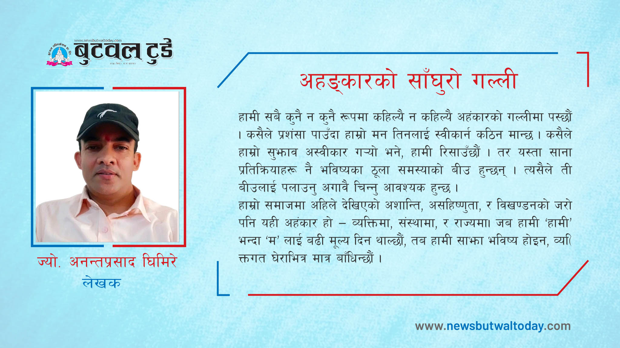 अहंकारले बनाएको गल्ली साँघुरो मात्र होइन, अँध्यारो पनि हुन्छ। किनभने त्यहाँ आलोचना सुन्न पाइँदैन, त्यहाँ सुधारको मौका दिइँदैन । त्यो गल्लीमा हिँड्नेलाई लाग्छ, ऊ एक्लै अगाडि बढिरहेको छ — तर वास्तवमा ऊ आफ्नो घेराभित्र घुमिरहेको हुन्छ । ऊ अड्किन्छ, बाँचिरहेको जस्तो देखिन्छ, तर बढ्दैन ।