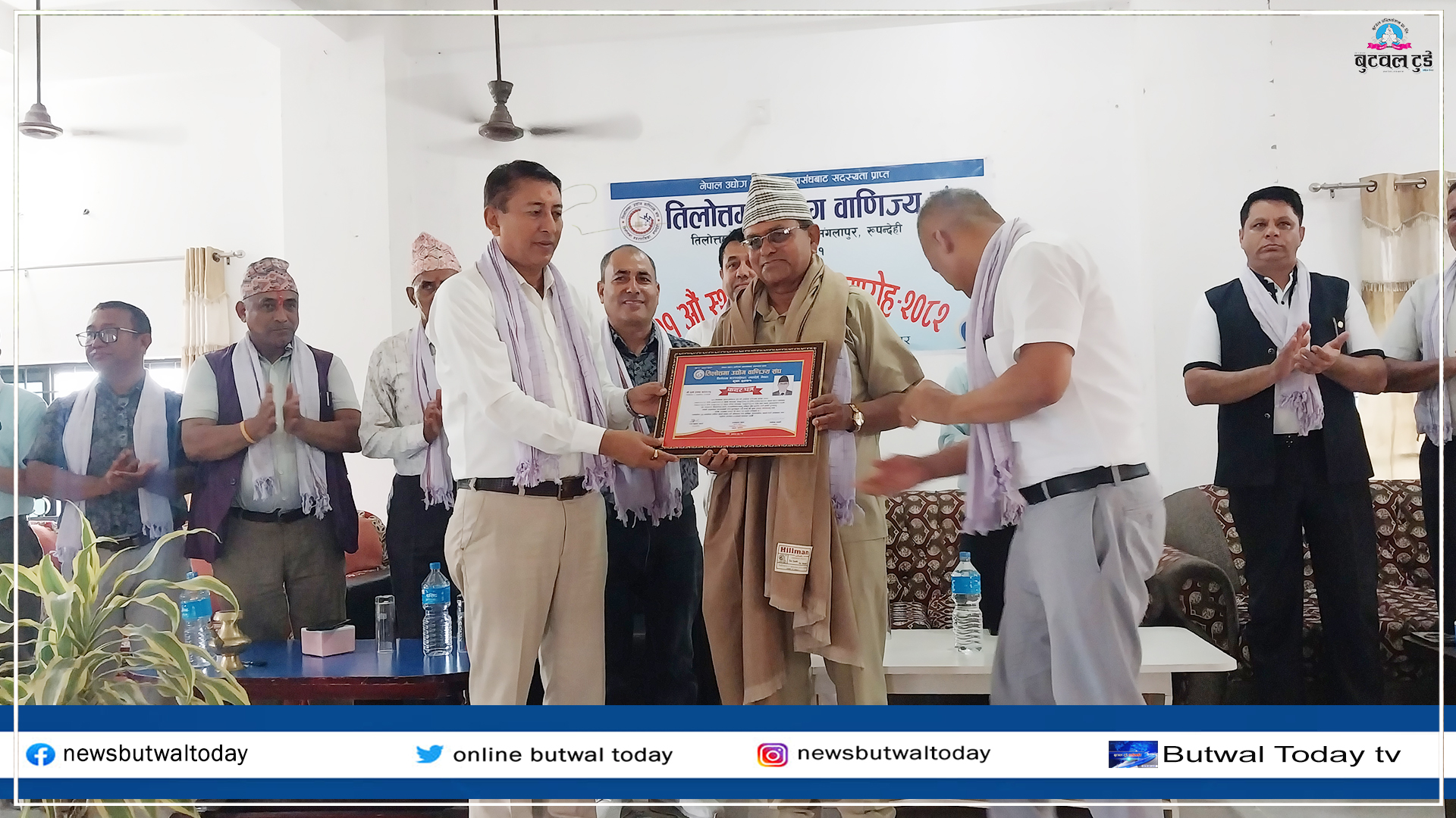 बुटवल, २० असार । तिलोत्तमा उद्योग वाणिज्य संघले आफनो ११ औ स्थापना दिवस विविध रचनात्मक कार्यक्रम गरि मनाएको छ । कार्यक्रमको तिलोत्तमा नगरपालिकाका नगर प्रमुख रामकृष्ण खांणले उद्घाटन गर्दै उद्योगी व्यवसायीहरुको संरक्षण गर्नुपर्ने र संरक्षण गर्ने दायित्व सरकारको भएको बताए । पछिल्लो समय उद्योगी व्यवसायीका समस्या बढेर गएको बताउंदै उनले समस्या र चुनौतीसंगै अवसर पनि भएकाले उद्योगी ब्यवसायीहरुलाई नआत्तिन आग्रह गरे । तिलोत्तमाको स्थानीय सरकार सधै साथमा रहेको समेत उनले प्रतिवद्धता जनाए । आर्थिक मन्दीका कारण उद्योगी व्यवसायीहरु बढी समस्यामा देखिएको हुदा यो विषयमा राष्ट्र बैंकले व्यवासायीहरुको समस्या बुझेर सहजताको अवस्था मिलाउनुपर्ने र संघीय सरकार गम्भीर हुनुपर्नेमा उनले जोड दिए । देशकै लागि तिलोत्तमा सम्भावित क्षेत्र भएको बताउंदै स्थायी प्रदर्शनीस्थल नहुंदा उद्योगी व्यवसायीले औद्योगिक मेला महोत्सव सञ्चालन गर्न समस्या भएकाले नदी उकासको जग्गा खाजेर समस्याको समाधान गर्ने गरि यो बिषय नीति तथा कार्यक्रममा समाबेस गरिएको बताए ।