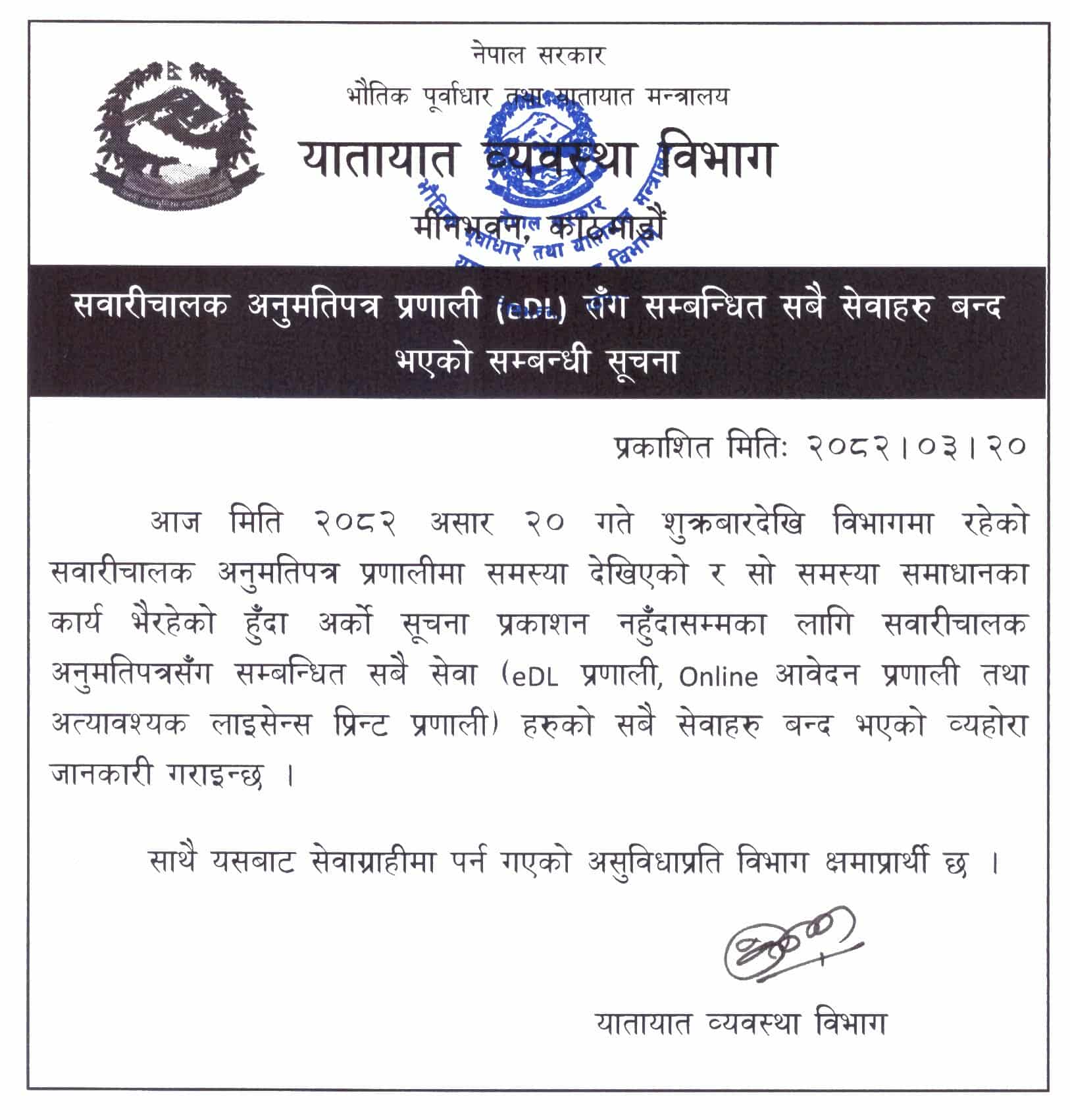 “आज मिति २०८२ असार २० गते शुक्रबारदेखि विभागमा रहेको सवारी चालक अनुमतिपत्र प्रणालीमा समस्या देखिएको र सो समस्या समाधानका कार्य भइरहेको हुँदा अर्को सूचना प्रकाशन नहुँदासम्मका लागि सवारी चालक अनुमतिपत्रसँग सम्बन्धित सबै सेवा बन्द भएको जानकारी गराइन्छ,” विभागले भनेको छ। विभागले यसबाट सेवाग्राहीलाई परेको असुविधाप्रति क्षमायाचना समेत गरेको छ।