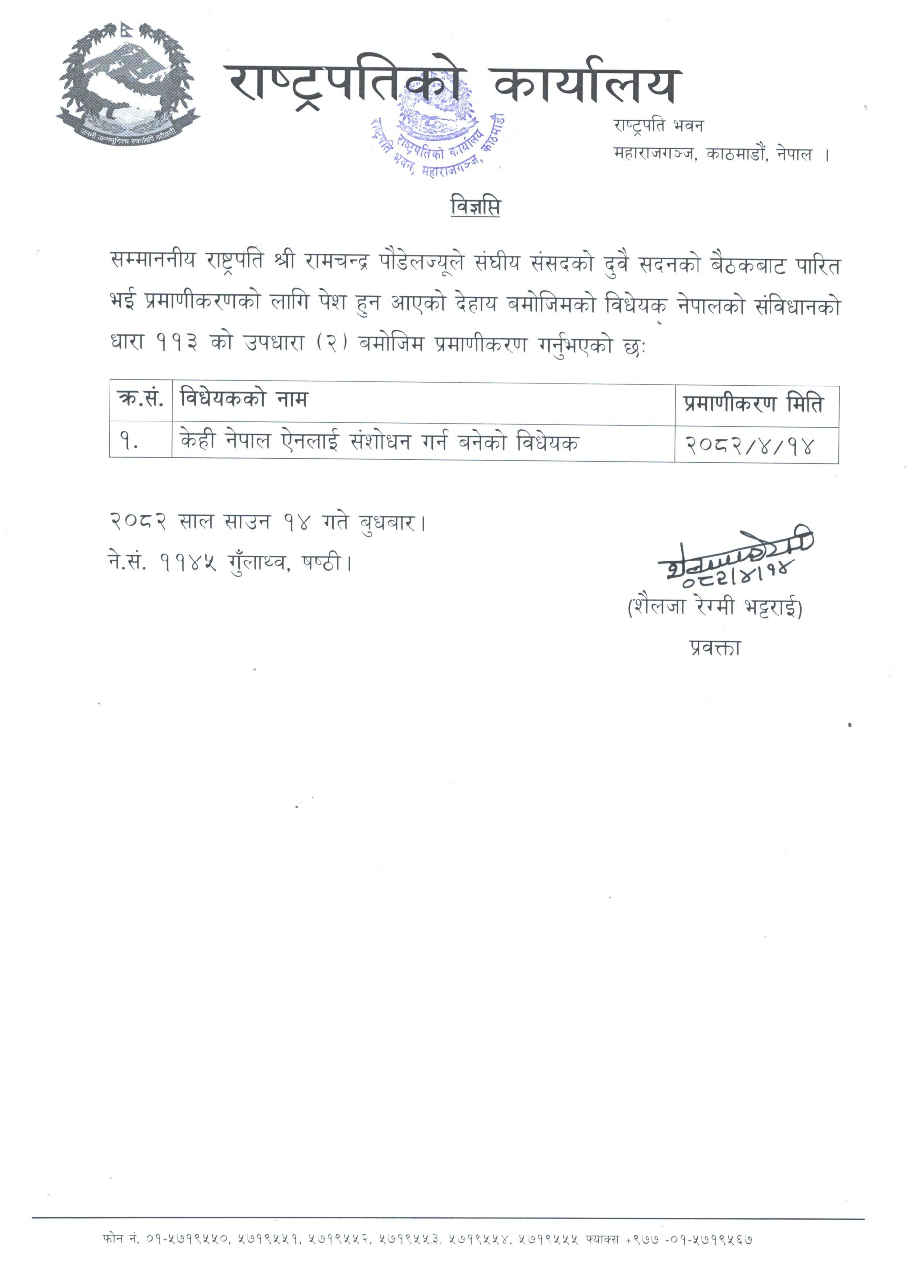 राष्ट्रपति कार्यालयकी प्रवक्ता शैलजा रेग्मी भट्टराईले जारी गरेको विज्ञप्ति अनुसार संघीय संसदको दुवै सदनको बैठकबाट पारित भई प्रमणीकरणको लागि पेस हुन आएको विधेयक नेपालको संविधानको धारा ११३ को उपधारा २ बमोजिम प्रमाणीकरण गरिएको हो ।