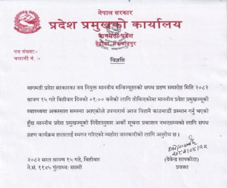 प्रदेश प्रमुखको कार्यालयद्वारा जारी विज्ञप्तिमा स्वास्थ्यमा समस्या देखिएपछि प्रमुख आजै काठमाडौं जानुपर्ने भएकाले शपथग्रहण कार्यक्रम अर्को सूचना नभएसम्मका लागि स्थगित गरिएको जनाइएको छ।