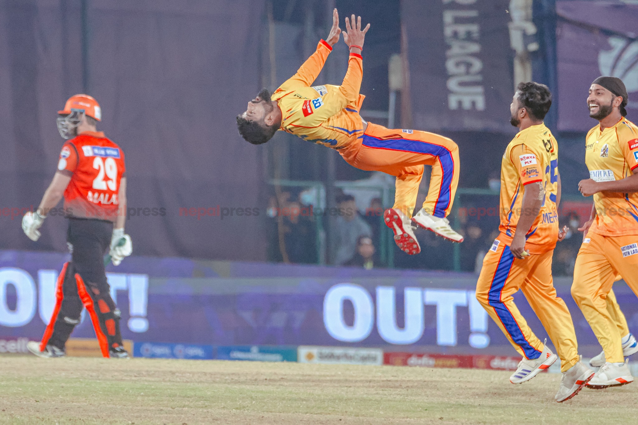 त्यस्तै, देव खनालले २८, अर्जुन साउँदले १६ र कुशल मल्लले १५ रन बनाए। अन्य खेलाडीले दोहोरो अंक पनि जोड्न सकेनन्।