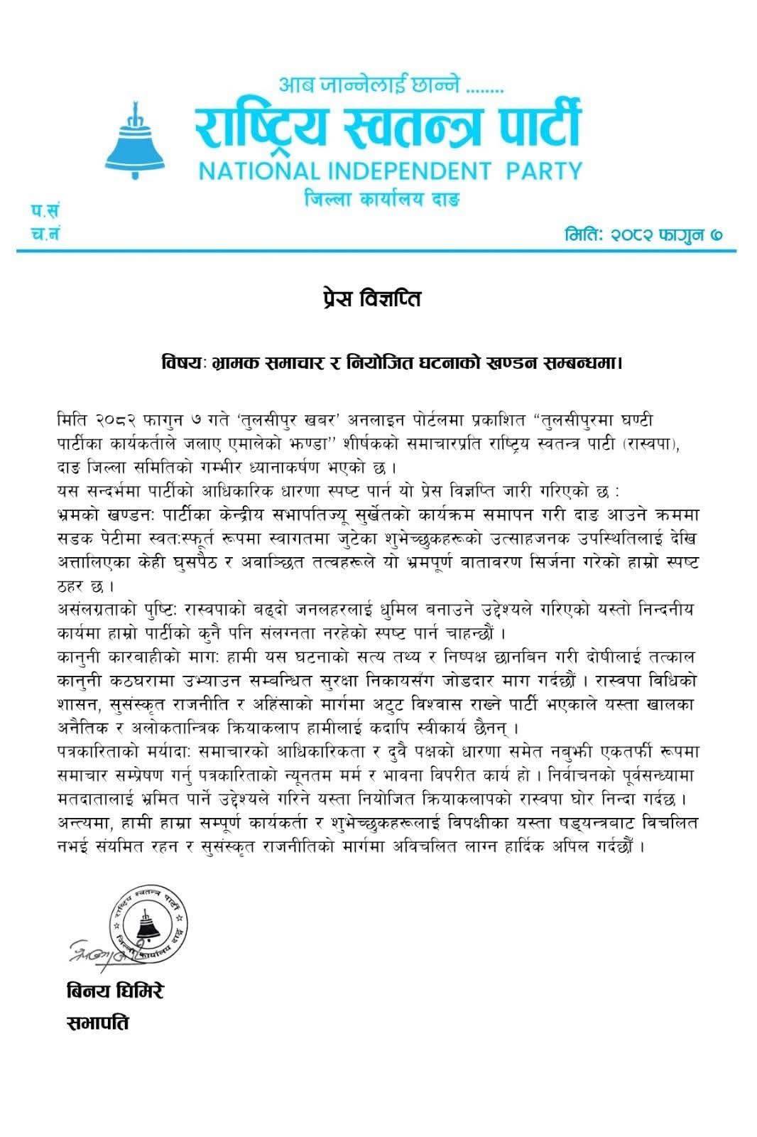 बुटवल । दाङमा राष्ट्रिय स्वतन्त्र पार्टी (रास्वपा)का कार्यकर्ताले नेकपा (एमाले)को झण्डा जलाएका छन् । शुक्रबार आयोजना हुने चुनावीसभाका लागि आउँदै गरेका पार्टी सभापति रवि लामिछानेको पर्खाइमा रहेका रास्वपाका कार्यकर्ताले बिहीबार साँझ एमालेको चुनाव चिह्न (सूर्य) जलाएका हुन् ।