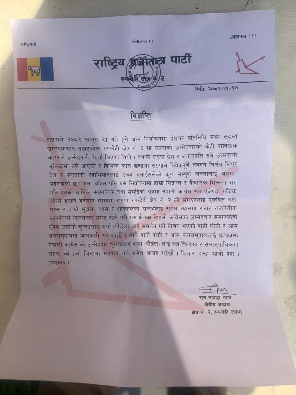 राप्रपाका रुपन्देही क्षेत्र नम्बर २ का अध्यक्ष रामबहादुर थापाले विज्ञप्ति जारी गर्दै रुपन्देही-२ मा प्रत्यक्षतर्फ नेपाली कांग्रेसका उम्मेदवारलाई मत दिने आह्वान गरेका छन्।