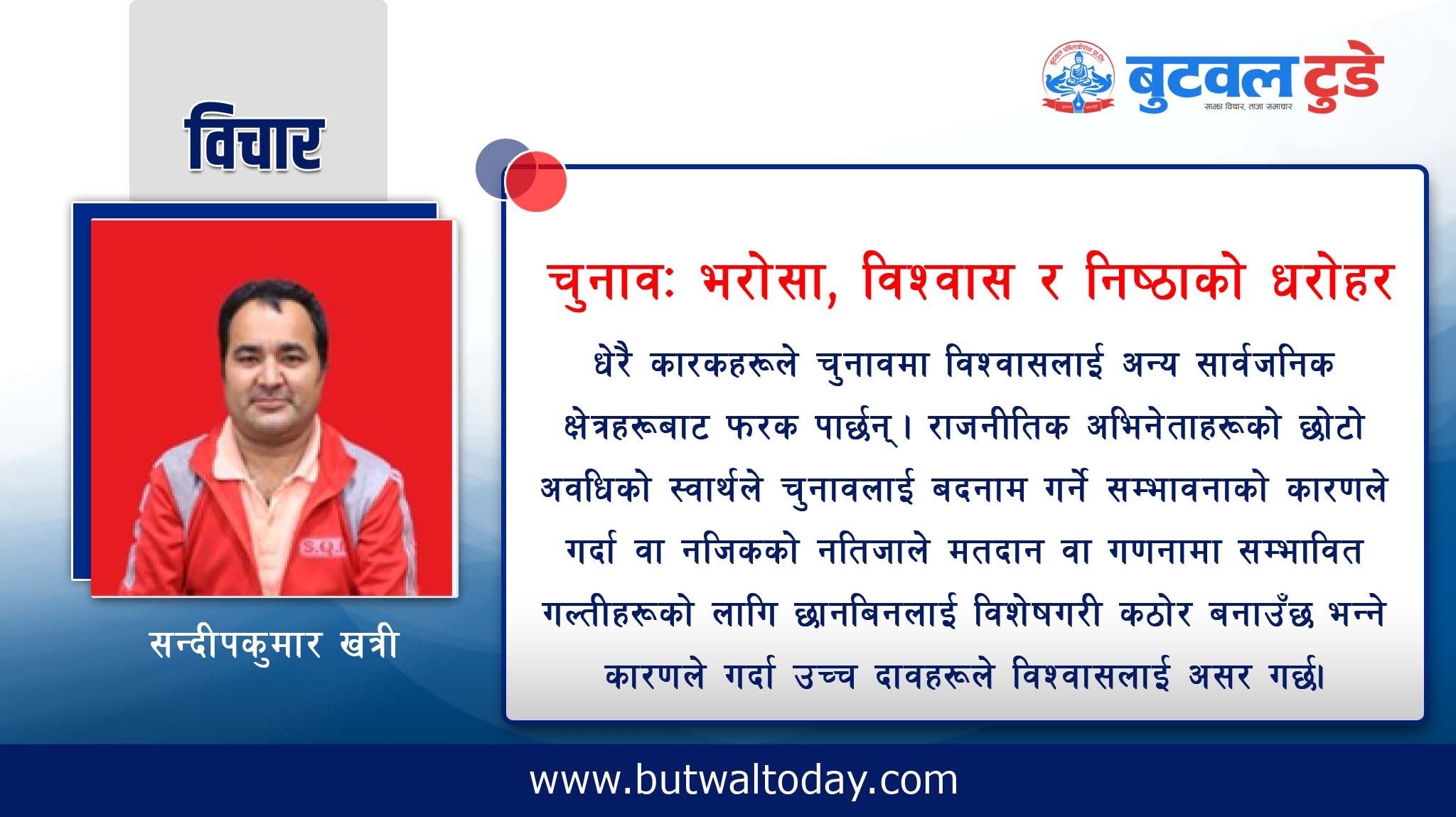 अव मतदाता निर्वाचनको हरेक कुरामा परिवर्तन भएको देख्न चाहन्छन् । तर, बर्षौंदेखि उनी चुनाव, उही मुद्दा, उही उम्मेदवार र कामभन्दा आश्वासन बढी हुँदा निर्वाचनमा जनताको रुची नै हराउने अवस्था आउन थालेको हो कि भन्ने चिन्ता थपिएको छ ।