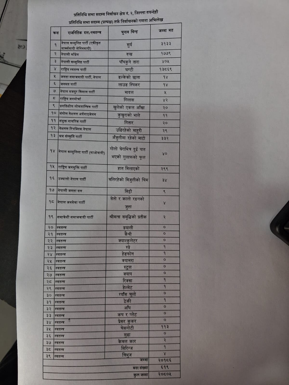 एमालेका उम्मेदवार विष्णु प्रसाद पौडेलले ३ हजार १३३ मत प्राप्त गर्दा कांग्रेसका चुन्न प्रसाद पौडेलले १ हजार ७७९ मत प्राप्त गरेका छन् ।