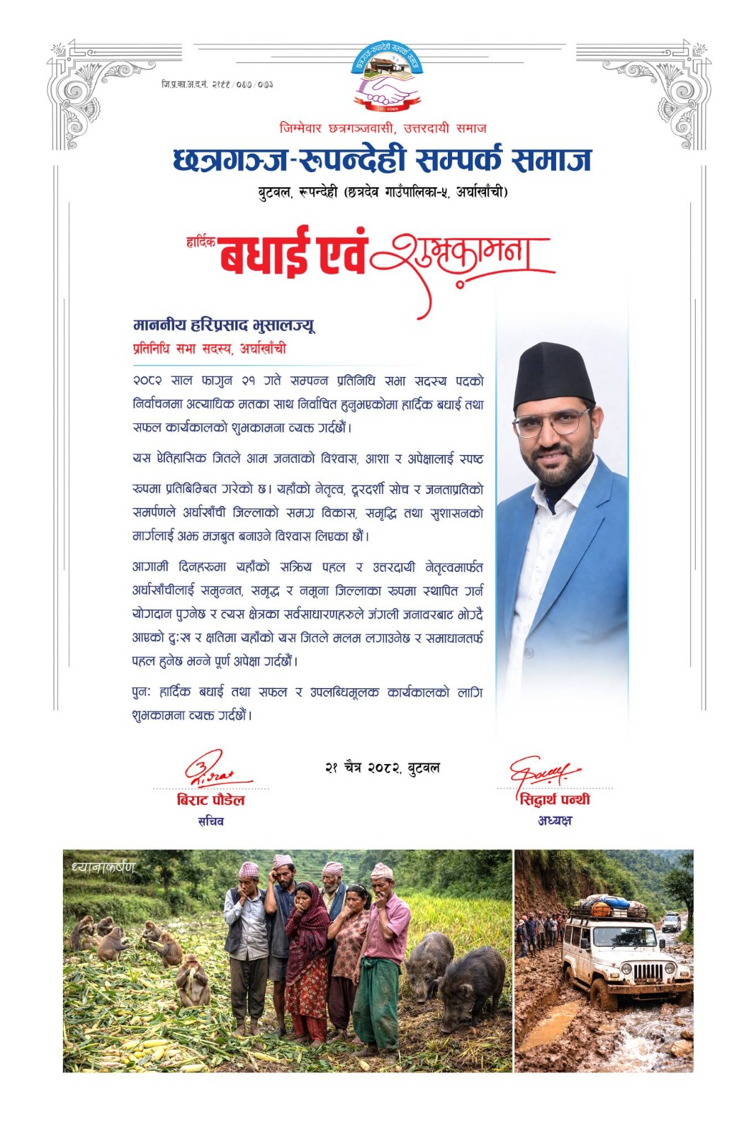 फागुन २१ गते सम्पन्न प्रतिनिधिसभा सदस्य निर्वाचनमा अर्घाखाँचीमा रास्वपाबाट निर्वाचित हरि प्रसाद भुसाल र अर्घाखाँचीमा जन्मेहुर्केकी समानुपातिक सांसद मञ्जु ज्ञवाली भुसाललाई बाँदर र बँदेलले हैरानी पुर्याएको भन्दै मायाको चिनोस्वरुप प्रदान गरिएको बधाईपत्रमा उल्लेख गरिएको छ। बधाई पत्रमा बाँदर र बँदेलका कारण खेतीबालीमा भइरहेको क्षतिबाट चिन्तित र प्रभावित भएको अवस्थालाई चित्रित गरिएको छ।