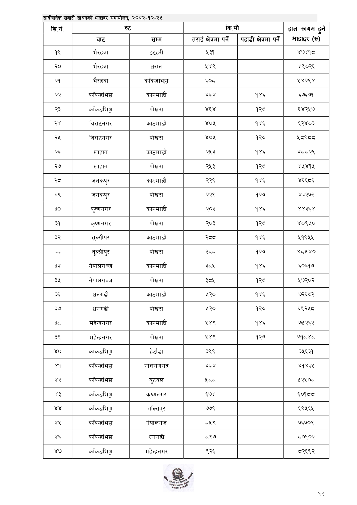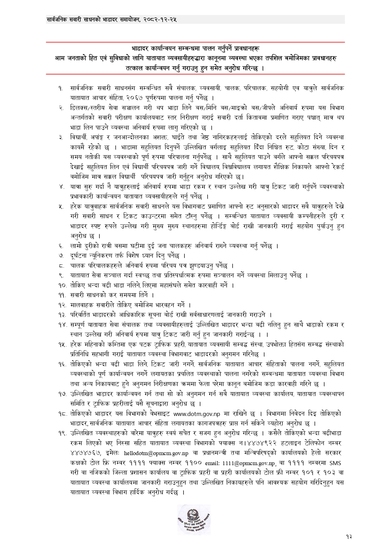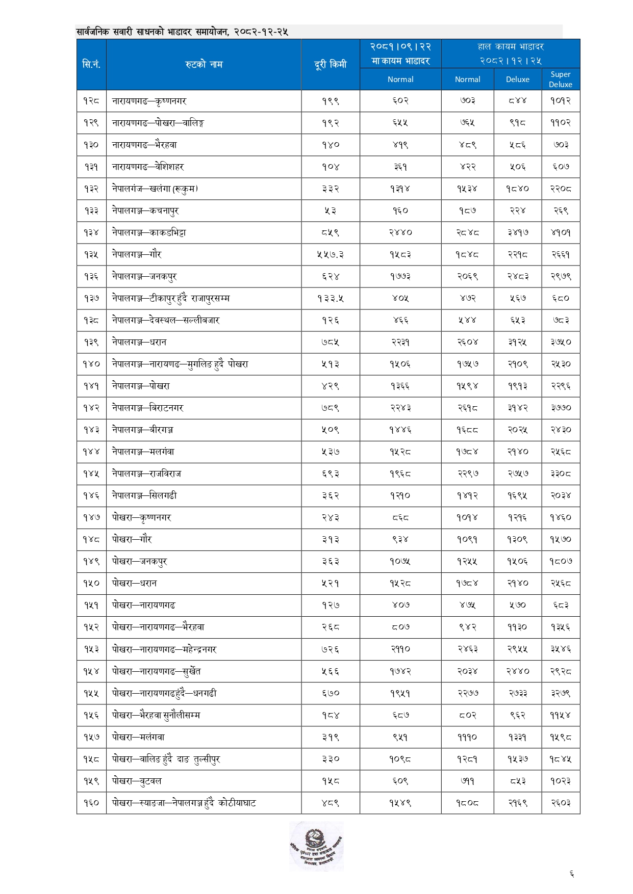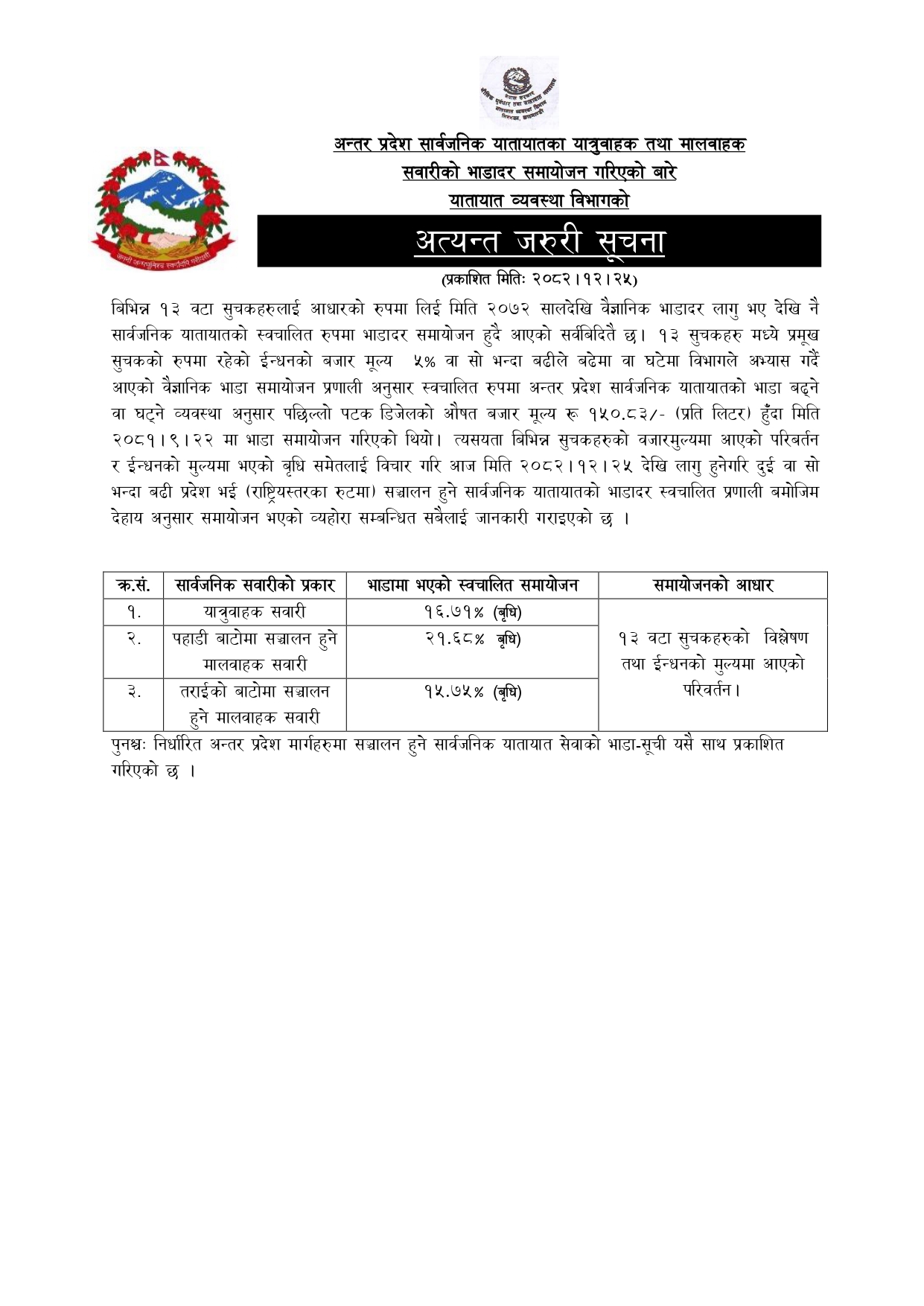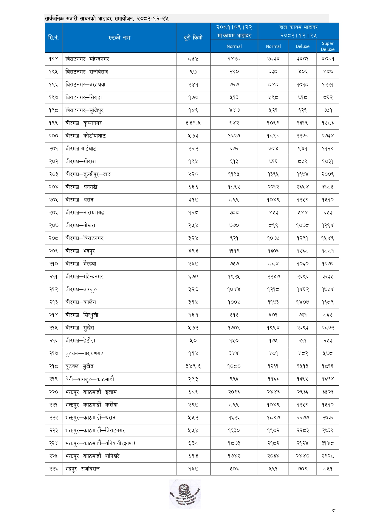 काठमाडौं । सरकारले सार्वजनिक यातायातको भाडा वृद्धि गरेको छ । यातायात व्यवस्था विभागका अनुसार इन्धनको मूल्यमा ५ रुपैयाँ थपघट हुदाँ भाडा समायोजन गर्ने व्यवस्था अनुसार यो निर्णय गरिएको हो । बढेको भाडादर आजैबाट लागू भएको छ ।