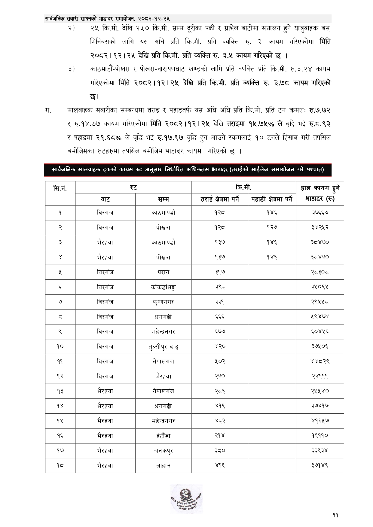 अब यात्रुबाहक सवारी साधनमा १६.७१ प्रतिशतले भाडा बढेको छ । पहाडी बाटोमा सञ्चालन हुने मालबाहक सवारी साधनको भाडा २१.६८ प्रतिशतले बढेको छ । तराईको बाटोमा हुने सञ्चालन हुने मालबाहक सवारी साधनको भाडा १५.७५ प्रतिशतले बढेको विभागले जनाएको छ ।