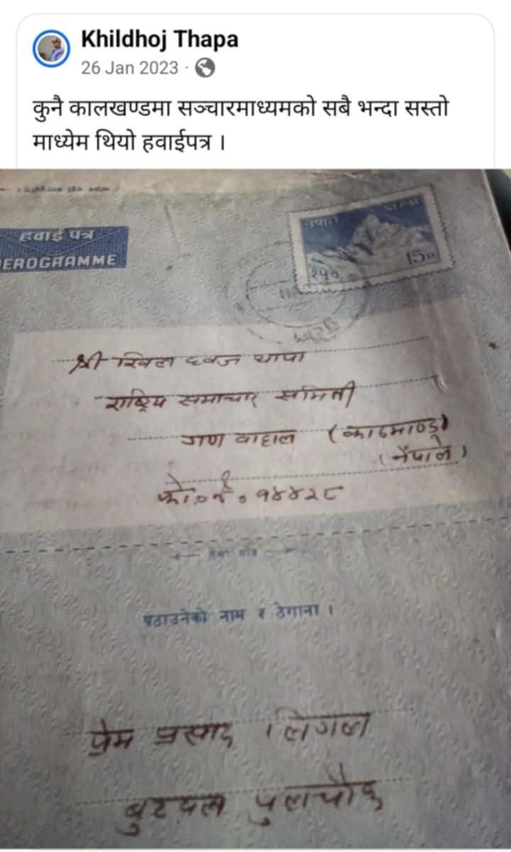 समय २०२६–२७ साल हुनुपर्छ । प्रस्तुत हवाई पत्रमा लेखिएको सामग्री प्रेमप्रसाद लिगलले बुटवलबाट खिलध्वज थापालाई राष्ट्रिय समाचार समितिमा सिसाका अक्षरमा समाचार बनाएर छाप्न पठाएको सामग्री हो ।