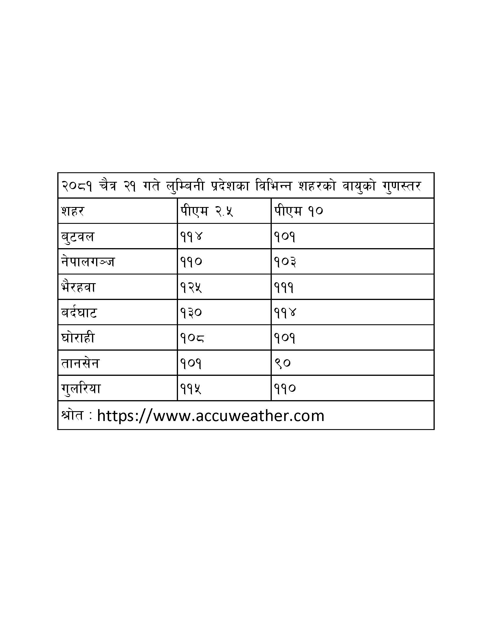 अहिले नेपालमा वायु प्रदुषणले निकै चर्चा पाईरहेको छ । वायु प्रदुषणले गर्दा विश्वका सहरमध्ये प्रदुषणका हिसाबले काठमाडौं १ नम्बरमा रहेको देखिएको भन्दै धेरैले चिन्ता व्यक्त गरे । स्वास्थ्य मन्त्रालय र विज्ञहरूले नागरिकलाई सकेसम्म घर वाहिर ननिस्कन, साँझ र विहान घुमफिर नगर्न आग्रह गरिरहेका छन् । काठमाडौंमा पीएम २.५ को मात्रा विश्व स्वास्थ्य संगठन (डब्लूएचओ) को मापदण्डभन्दा ५ गुणासम्म बढी भएकोले स्वास्थ्यमा गम्भीर असर पार्न सक्ने भन्दै स्वास्थ्यकर्मी र वातावरणविदहरूले चिन्ता गरीरहेका छन् । लुम्बिनी प्रदेशको दक्षिणमा रहेको भारतिय भूमिमा वायु प्रदुषणको अवस्था चिन्ताजनक रहेको र प्रदेश भित्रकै आन्तरिक कारणले पनि यहाँको वायु प्रदुषित भैरहेकोले लुम्बिनीवासीलाई चिन्तित बनाएको छ ।