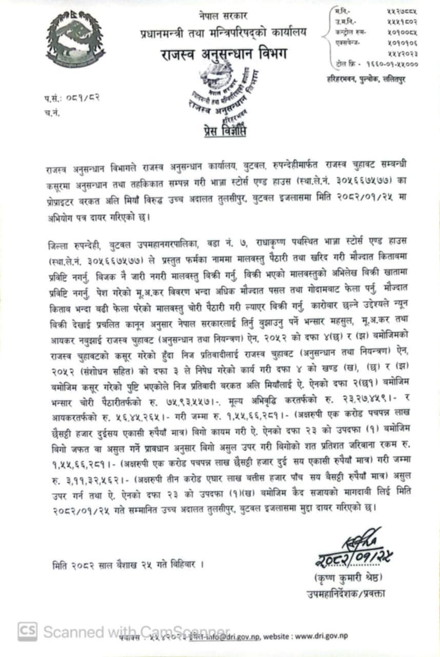 आन्तरिक राजश्व कार्यालय बुटवलका प्रमुख राजश्व अधिकृत विवेक घिमिरेका अनुसार भाञ्जा स्टोर्स एण्ड हाउसका प्रोप्राइटर बरकत अलि मियाँविरुद्ध उच्च अदालत तुलसीपुर, बुटवल इजलासमा राजस्व चुहावट गरेको प्रमाणका आधारमा मुद्दा दायर गरिएको हो ।